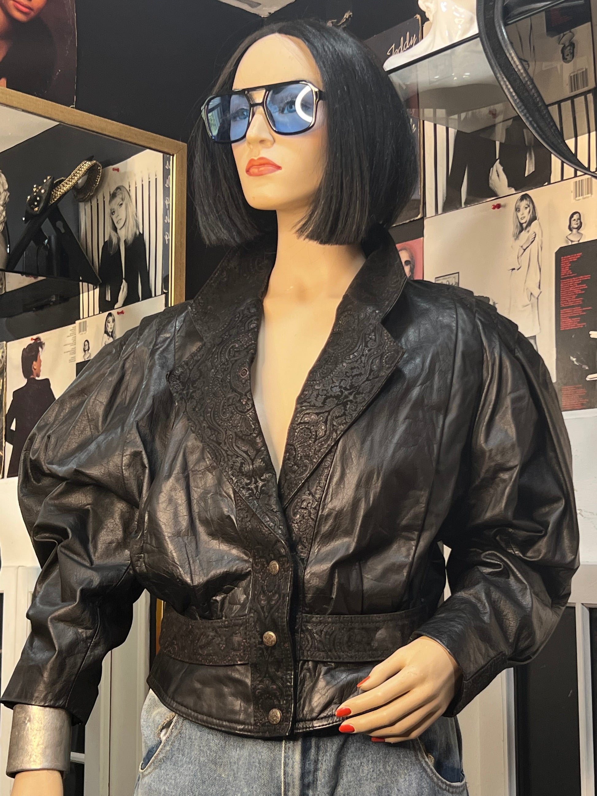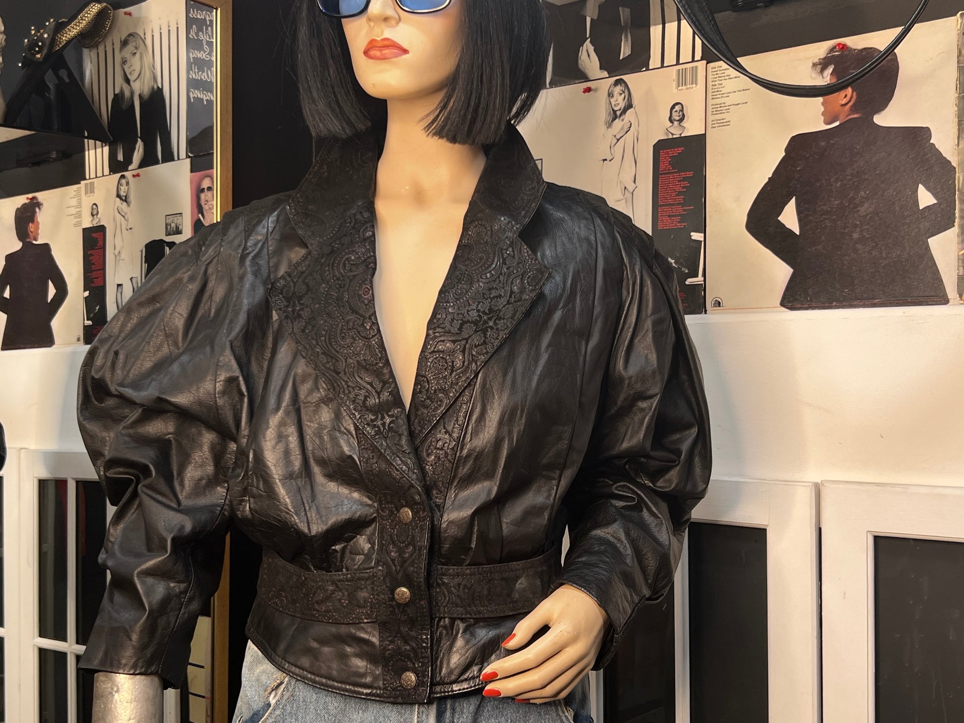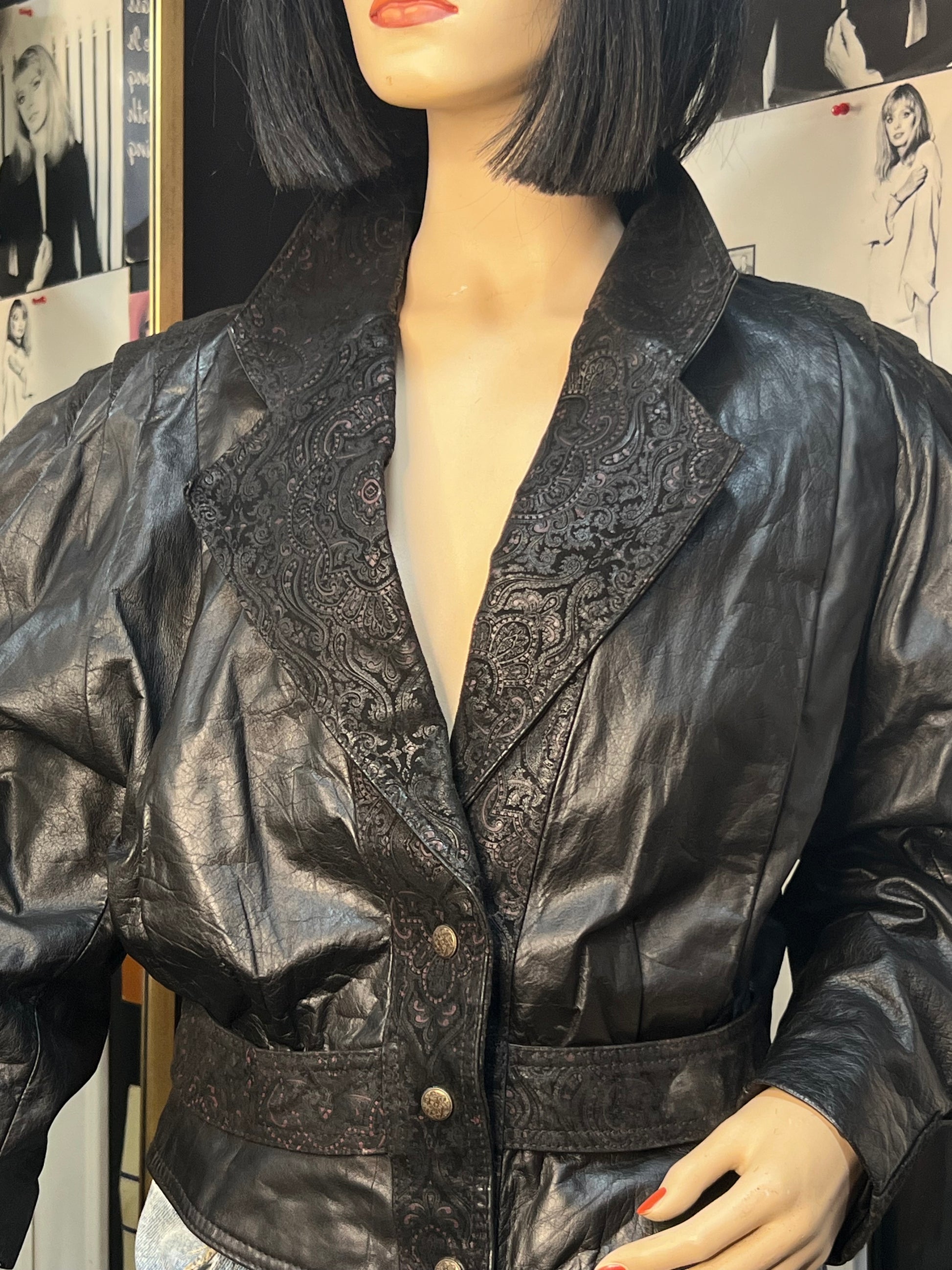 Expertly crafted, this vintage waist length jacket boasts a bold floral print and can fit up to a size medium when closed or a size large when worn open. Elevate any outfit with this versatile and stylish statement piece.