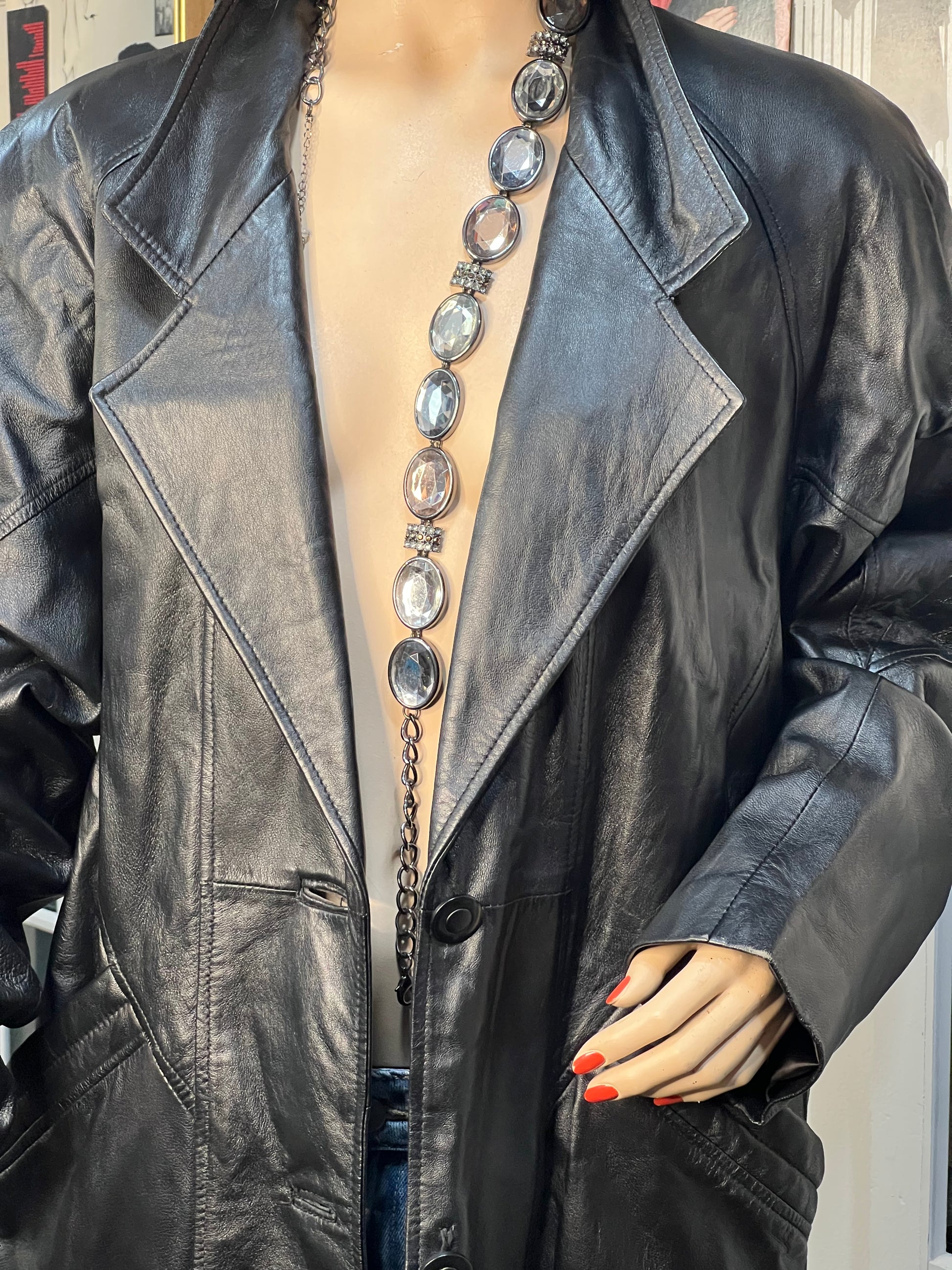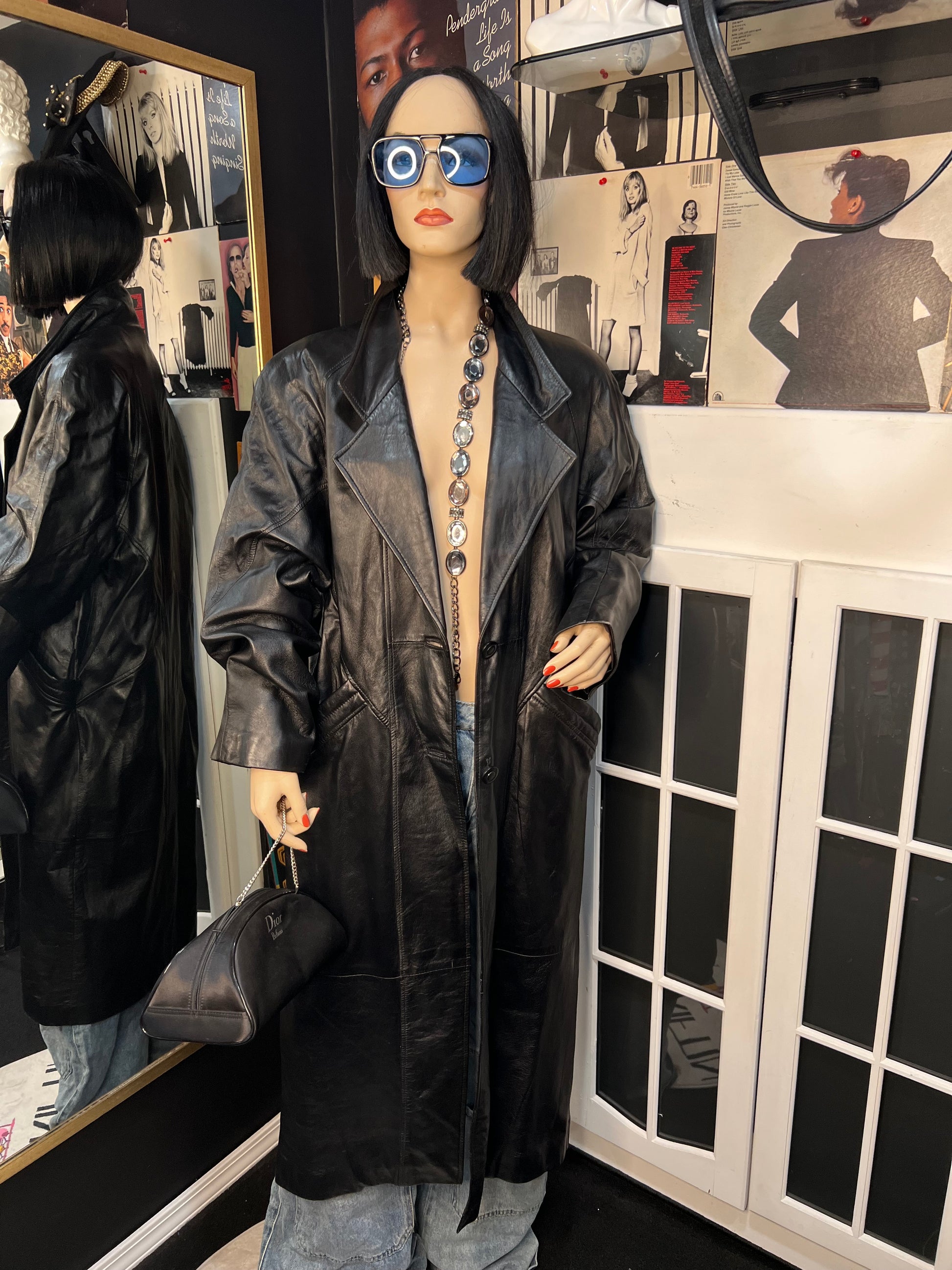 Expertly crafted from genuine leather, this 90s black full length coat in size large (fits up to xl) is the perfect vintage piece for any wardrobe. Despite a minor flaw on one sleeve, the quality and style of this jacket remain unmatched. Make a statement with this timeless and durable coat.